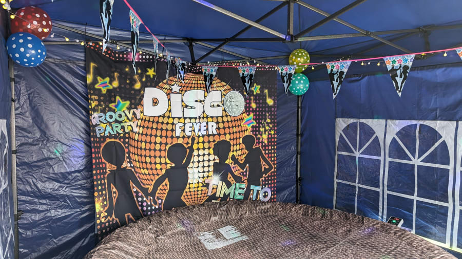 Premium Gazebo: Adorned with vibrant disco bunting and dazzling decorations, the gazebo transforms into your very own disco haven.